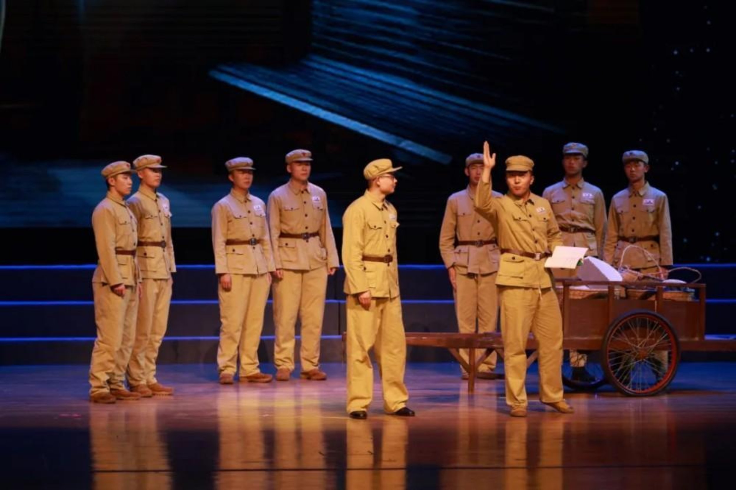 “人在——阵——地——在!”一声嘶吼划破舞台的宁静,瞬间将全场气氛推向高潮。聚光灯下,姜劲纲身着沾满“血污”的军装,屹立在“战壕”中,挺拔的身影仿佛与历史重叠。谁也想不到,这位在舞台上爆发出惊人力量的学员演员,几天前还因急性阑尾炎躺在病床上。尽管编导组一直建议他住院休息,但是他仍然选择“人在阵地在”。当大幕拉开、当灯光亮起,那一刻,他全然忘却了身体的不适,将自己完全代入角色。