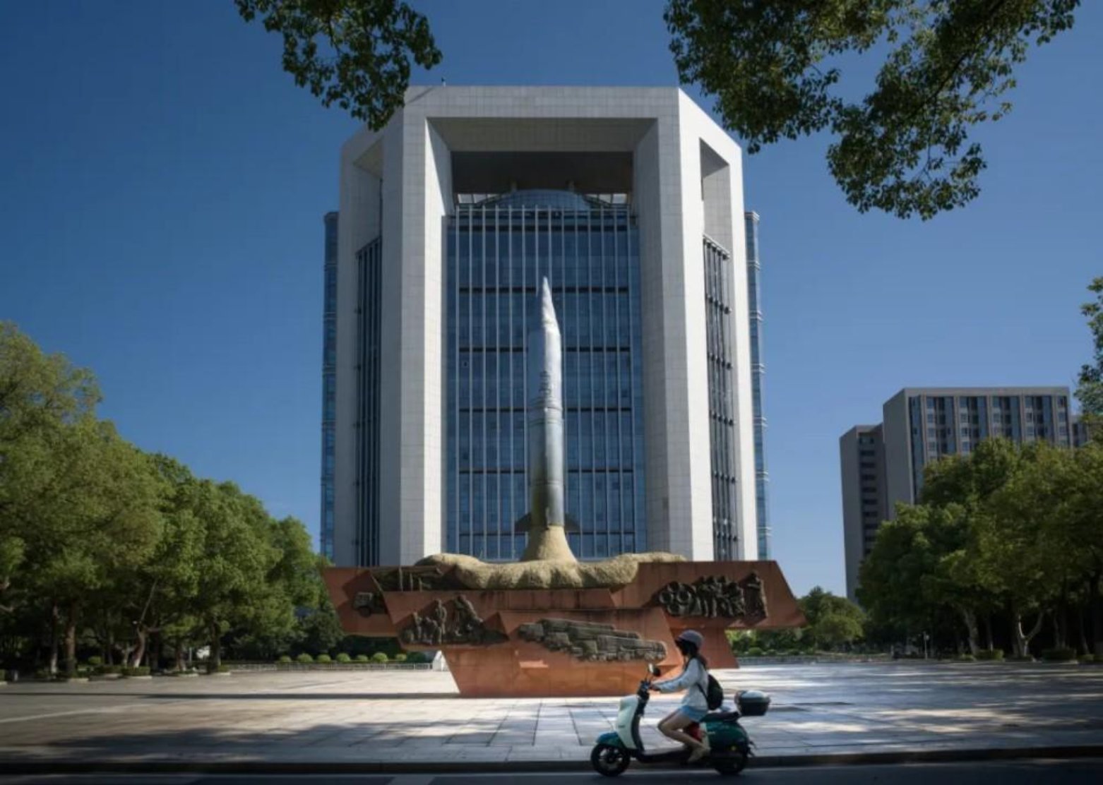科技大楼矗立在蓝天之下,其旁的导弹雕塑气势恢宏,底座的浮雕诉说着国防科研的历程。这里汇聚学校多个重点实验室,年轻的学子在此挑灯夜战破解难题。一位学生骑车驶过,在科研与青春的交汇点,彰显着对国防科技探索的蓬勃朝气。
