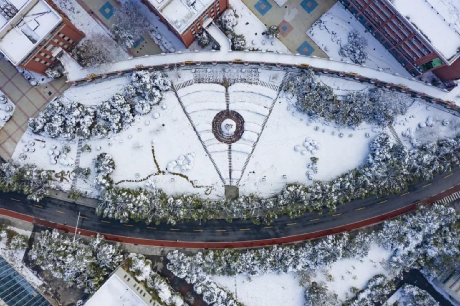 航拍视角下,三号院教学楼前的花园银装素裹,宛如一只澄澈的眼睛。白雪覆盖的植被与步道构成“眼”的肌理,中央的圆形景观是灵动的瞳孔,似在以纯净的雪景视角“看世界”。红顶建筑与道路环绕其周,为这冬日雪景添了几分雅致与静谧。